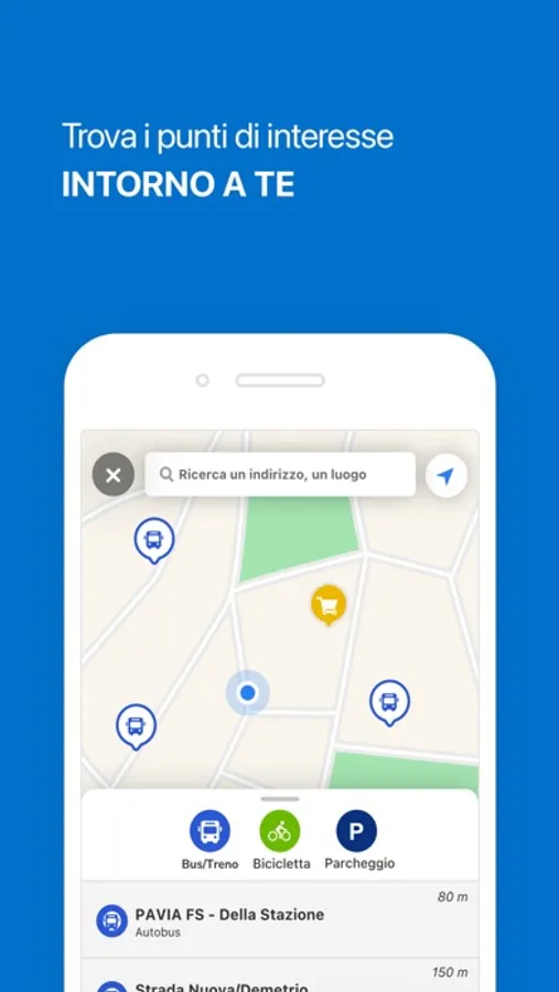 - Geolocalizzazione delle fermate, stazioni, stazioni bici, parcheggi vicino a te
