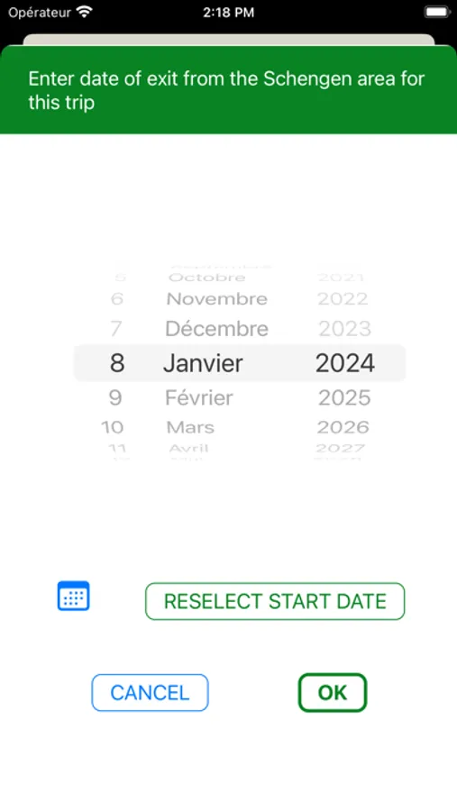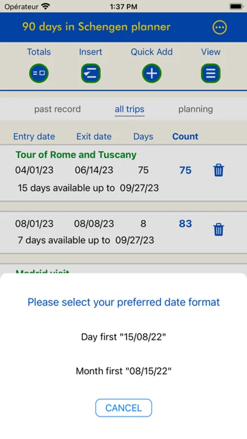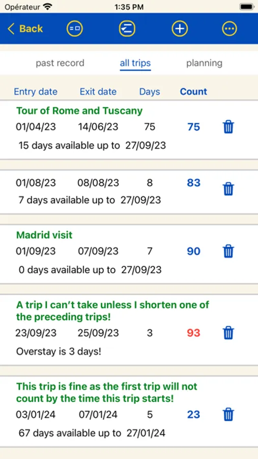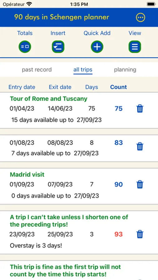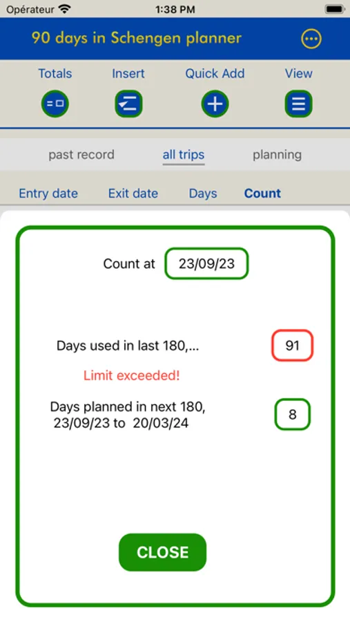 See the running total of days which will be counted by the end of each trip. You can also choose any date to view the total days used and planned at that date, and the dates of the past and future 180 day reference period which apply to that date.