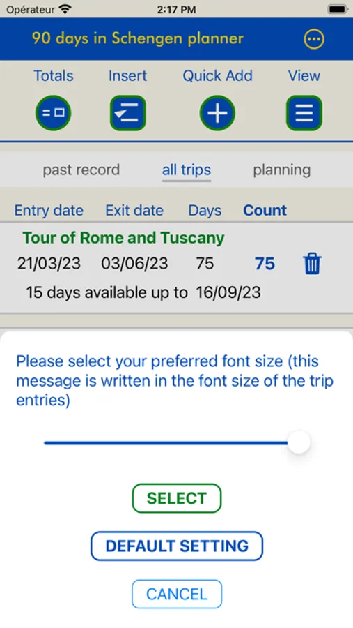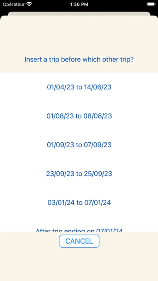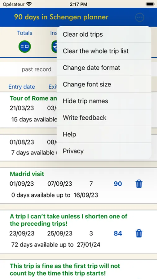 Tap the menu item “Clear old trips” to delete all of the previous trips which end before the current reference period and so are no longer relevant.