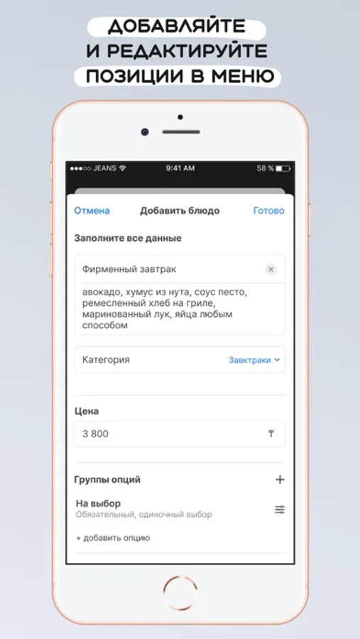 Приложение позволяет оперативно создавать новые и корректировать существующие блюда. Также вы можете временно включать/выключать блюда при возникновении такой необходимости.