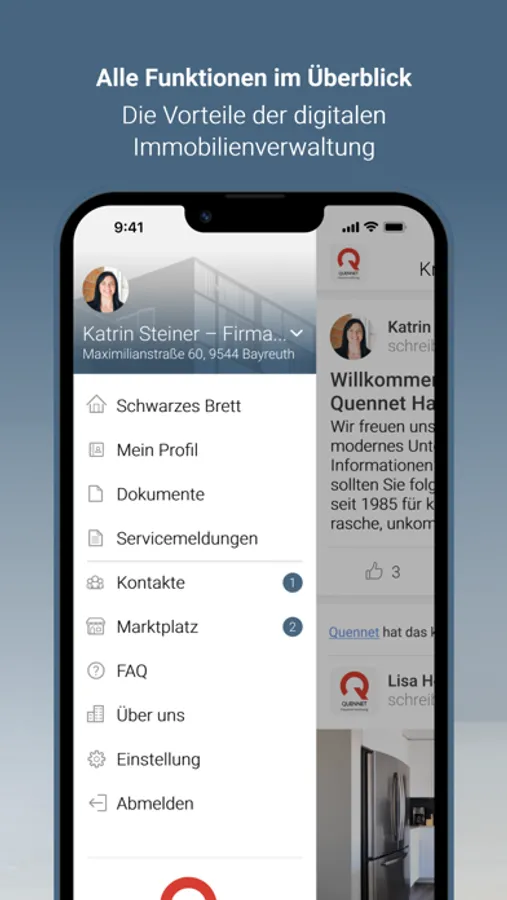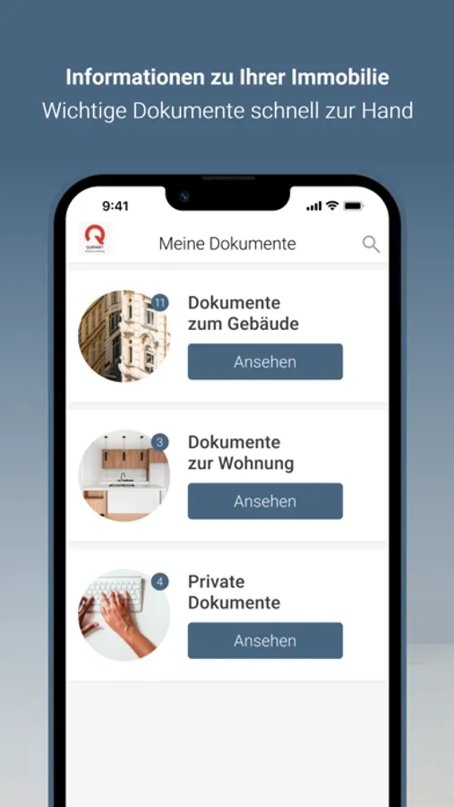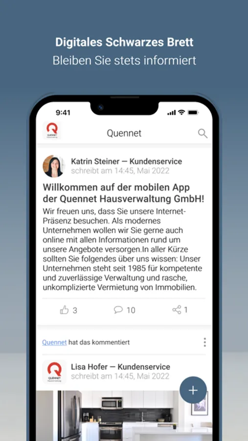 Als Kunde der Quennet Hausverwaltung GmbH profitieren Sie von einem besonders innovativen Kundenservice, der Ihnen viele Freiheiten bietet. Mit der Quennet App können Sie uns rund um die Uhr Anliegen und Schäden inklusive Fotodokumentation per Smartphone melden. Zusätzlich stellen wir Ihnen eine digitale Dokumentenmappe mit wichtigen Dokumenten für Ihre Immobilie(n) zur Verfügung. Über das digitale schwarze Brett informieren wir via Push-Nachricht proaktiv über wichtige Informationen rund um die uns anvertrauten Immobilien.