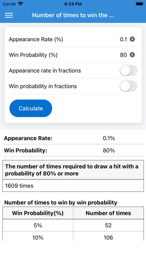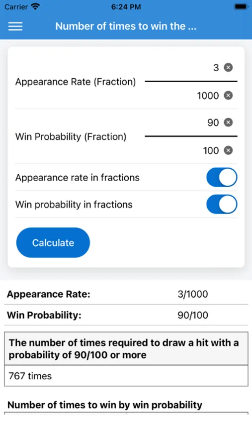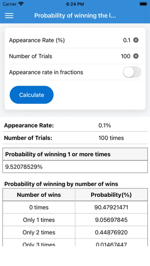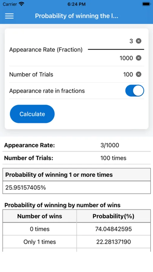 It is an application that calculates the probability of winning by lottery or gacha.