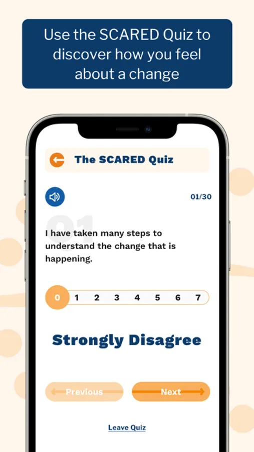 The next part focuses on your feelings and asks you to critically reflect on what is happening to you. By reflecting on each letter, SCARED helps you make an informed decision through your reflection and actions. We do this with a 30-question quiz to understand how you are feeling towards the change. Many questions are similar, and they are intended to be that way. The goal is to stop and reflect on change so you can make the best decision about it.
