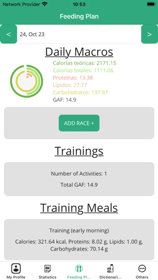 Tab three, feeding plan: the nutritional and supplementation plans are reflected for each scheduled intake during the day, as well as daily calorie and macronutrient values. We can also incorporate training sessions into the same plan. Within each intake, new foods or dishes can be incorporated, as well as different types of supplements and quantities. In the nutritional plan itself we have the option of doing it as a race or as training. It can be managed by the user themselves and by the administrator at the same time. The diet can be planned in advance or can be planned on the spot.