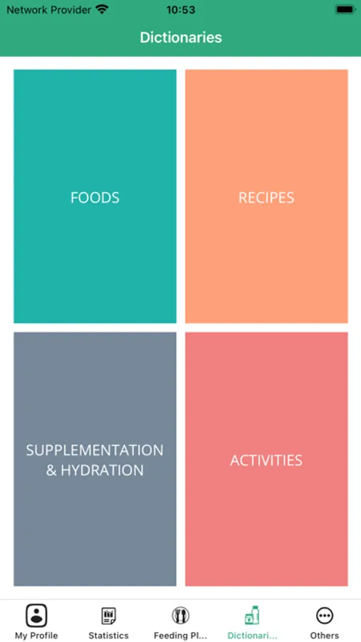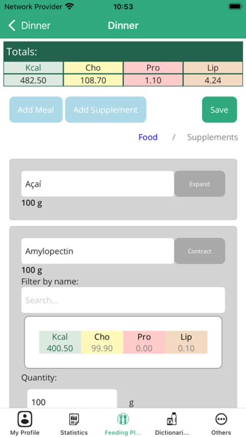 Tab four, dictionary: the foods included in the application appear in addition to the recipes, recommended supplements and activities. You can see the amount of macro and micro-nutrients in each food as well as the preparation and nutritional value of each dish.