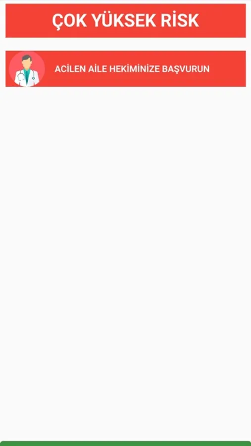 ÇOK YÜKSEK RİSK: Sonucunuzun çok yüksek risk çıkması sizin bu hastalığa sahip olduğunuz anlamına gelmemekle birlikte sorulara verdiğiniz yanıtlar bu hastalığı ciddi şekilde düşündüren belirti ve risk faktörlerini taşıdığınızı gösteriyor. Acilen hekiminize başvurmanızı tavsiye ederiz.