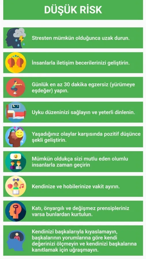 DÜŞÜK RİSK: Sonucunuzun düşük risk çıkması bu hastalığı düşündüren risk faktörleri ve belirtilerine sahip olmadığınızı göstermekle birlikte bu hastalığa hiç yakalanmayacağınız anlamı taşımamaktadır. Tavsiye ettiğimiz önerileri uygulayarak bu hastalığa ait risk düzeyinizi daha fazla düşürebilirsiniz.