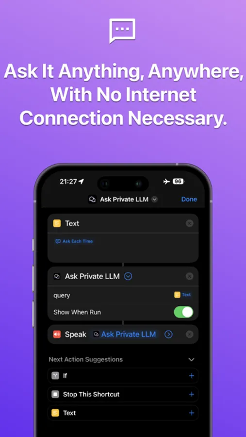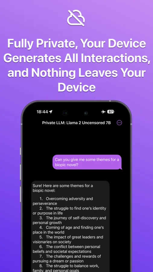 Stay productive on the go with Private LLM's offline functionality. Summarize lengthy paragraphs, unlock creative ideas, and enhance your learning experiences, all without needing an internet connection. Plus, enjoy the convenience of sharing Private LLM with your family through Family Sharing.