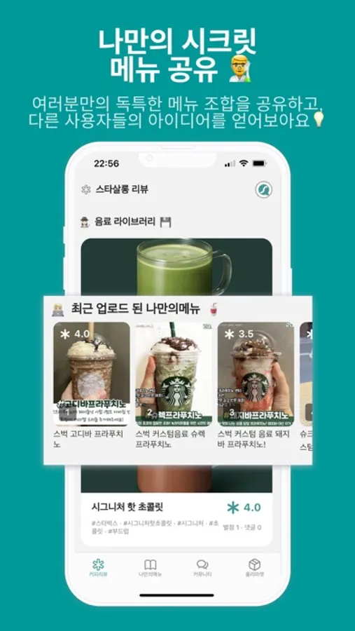 스타살롱은 커피애호가들이 모여 평점을 남기고 서로 의견을 공유하며 다양한 이야기를 나눌 수 있는 커뮤니티 앱입니다. 스타살롱은 다음과 같은 네 가지 게시판으로 구성되어 있습니다.