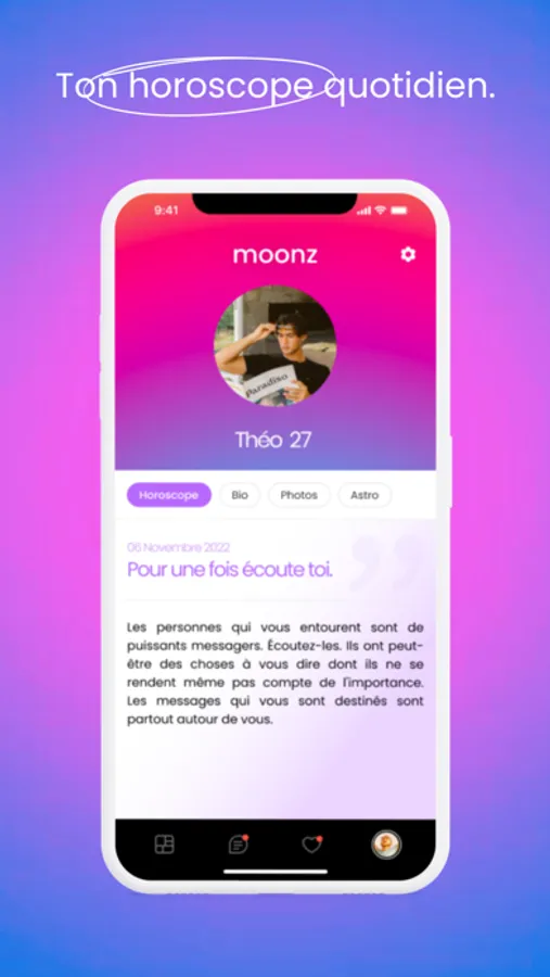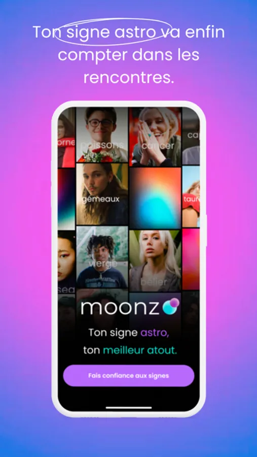 Sur moonz fini les photos de profil classiques. Nous voulons que le premier aperçu visuel ne révèle pas uniquement la physique. La mosaïque te permet donc de relever ta personnalité, ton univers, mais aussi ton signe astro en un simple coup d'œil.