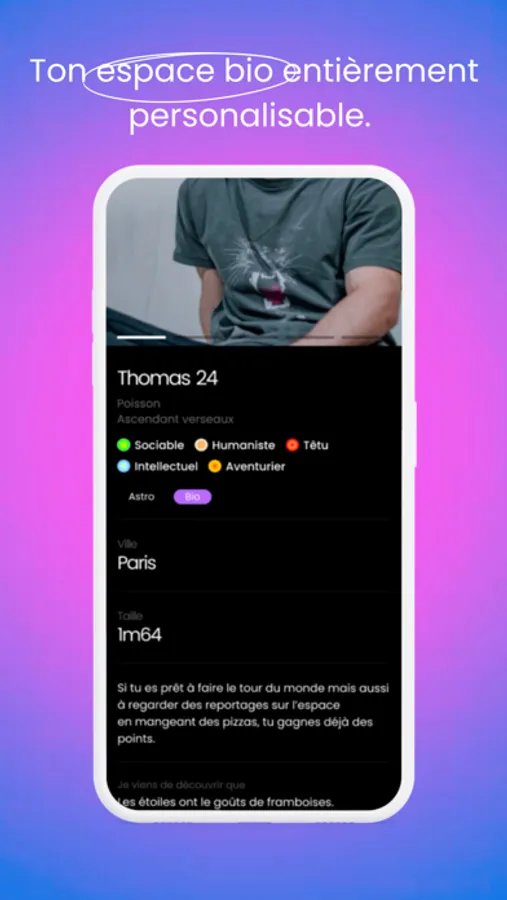 Crée ta mosaïque de photos pour partager ton univers avec les autres, et rencontrer des personnes compatibles, tant sur le plan de l’astro que sur celui de la personnalité.