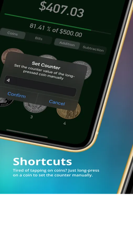 Shortcuts allow you to further set the value of the counter manually, without the need to tap on the coins repetitively.