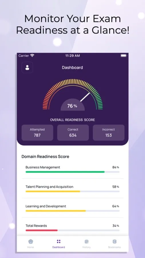 Assess your preparedness for the real exam with our innovative readiness score feature. This insightful tool guides your study focus, highlighting the areas needing more attention.