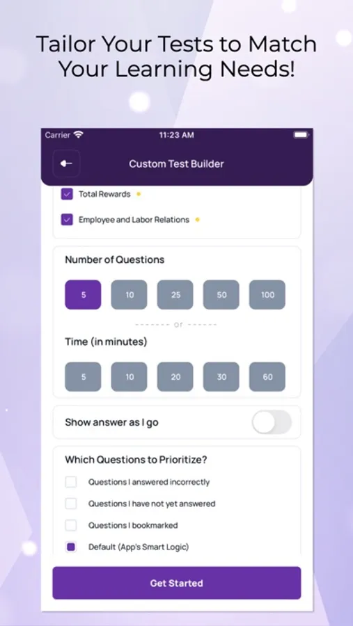 Our custom test builder allows you to tailor your practice sessions. Choose specific topics and questions and create tests to cater to your study needs. This tool curates a mix of new and challenging questions, helping you fortify your weak areas.