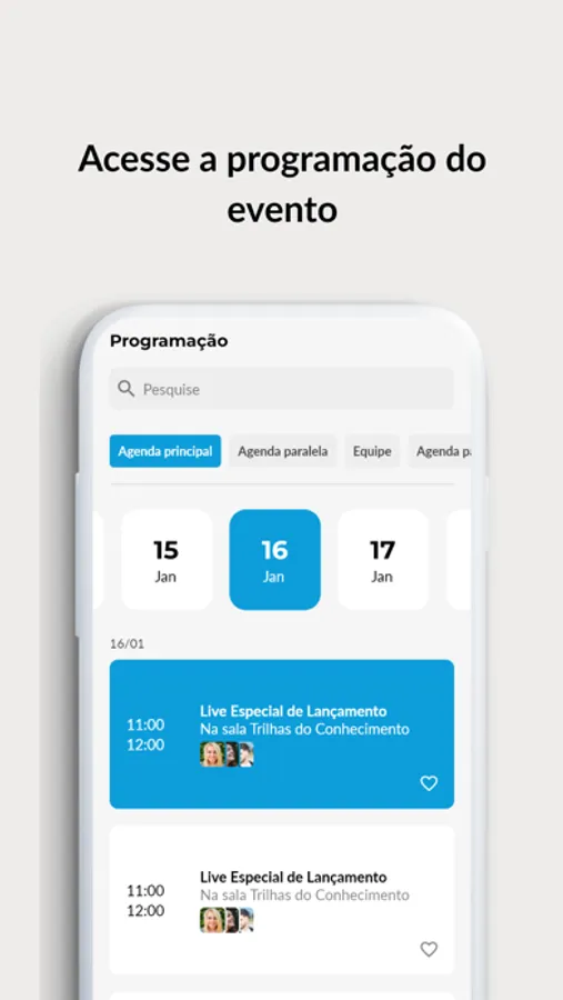 Com o aplicativo “World Tour São Paulo”, você tem acesso a uma rede social exclusiva, pode fazer novos contatos, enviar perguntas aos palestrantes, trocar mensagens com outros participantes, enfim, interagir com a comunidade. Além disso, você pode consultar a programação, avaliar conteúdos, dar feedback e responder quizzes. Utilize o APP e aproveite ao máximo os recursos.