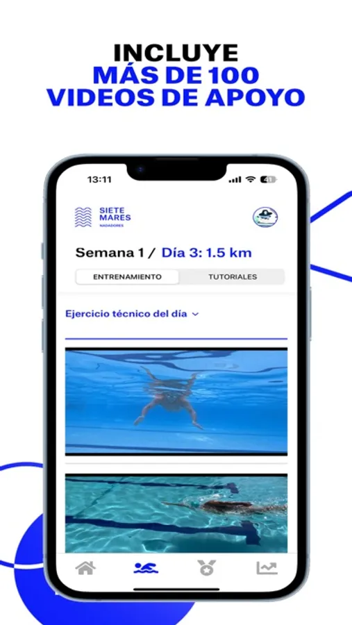 - Cada entrenamiento incluye videos con ejercicios de: técnica de nado, entrada en