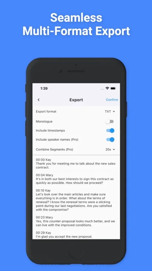 Easily export your transcriptions in various formats, such as TXT and SRT.