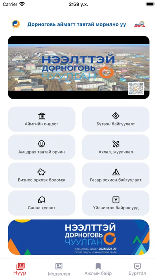 Дорноговь аймгийн танилцуулга аппликейшн нь тухайн цаг үеийн мэдээ мэдээлэл, бүтээн байгуулалт, бүртгэл зэрэг үйл ажиллагааг бүрдүүлсэн аппликэйшн юм.