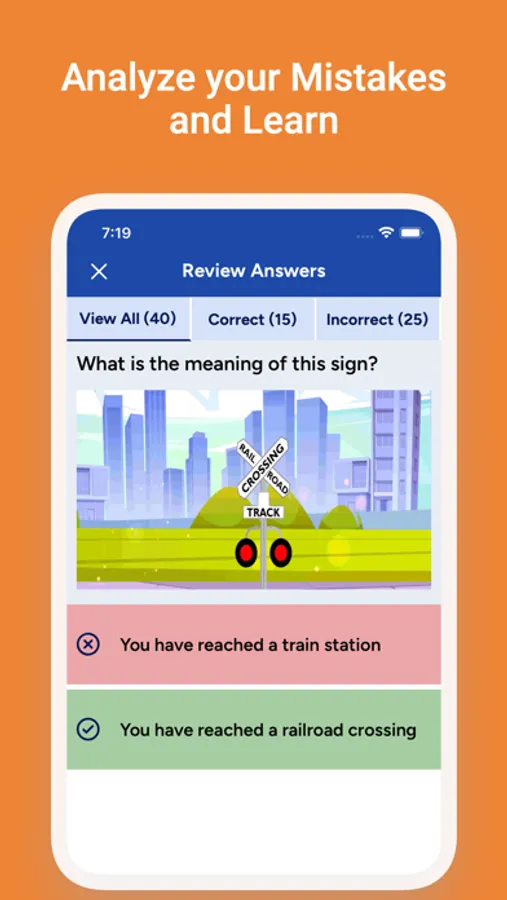 You will get the test result based on the official criteria to pass the Driver’s License Test. You will also be able to find out what questions you've done wrong after taking the test.