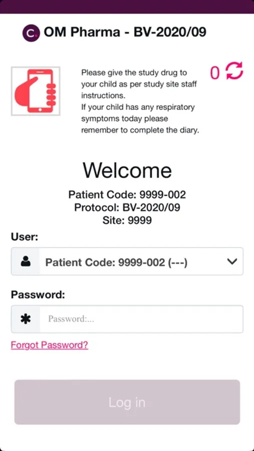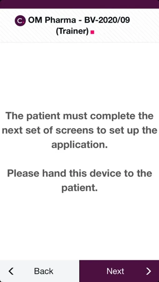 OM Pharma eCOA App is intended for collecting patient reported outcomes relating to a clinical trial. Patients must be given accounts by a participating site in order to log in to the app.