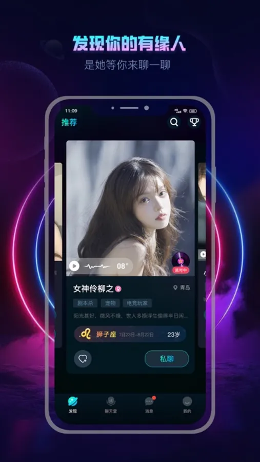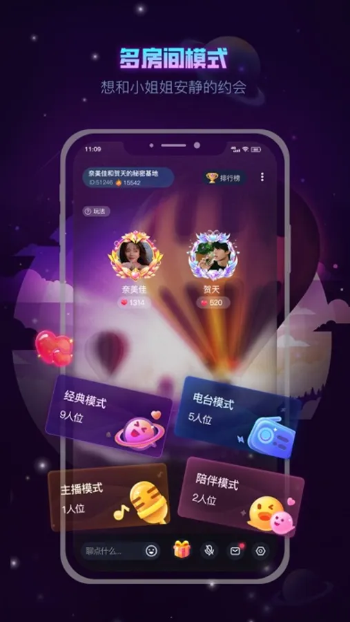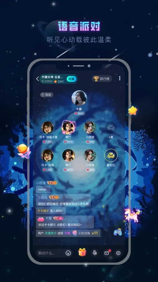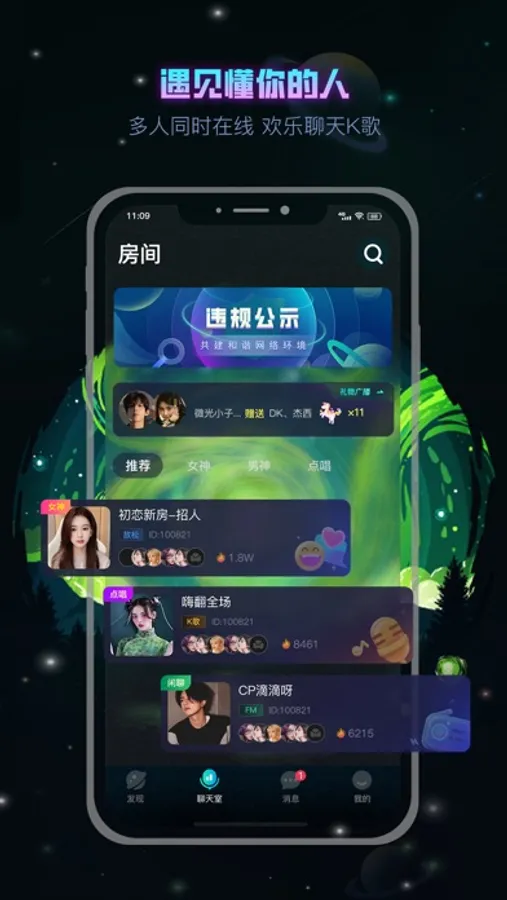 一款多人语音集合的社交平台,对喜欢的主播进入对应语音房一起讨论。