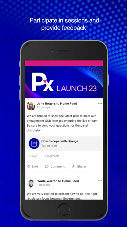 The PX Launch 23 app is the official mobile app for the PX 23 Launch Meeting. The app combines engaging content with interactive tools to deliver an exciting launch experience.