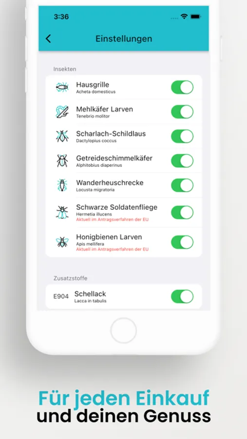 In den Einstellungen haben Sie die Möglichkeit auszuwählen, auf welche Insekten oder Zusatzstoffe geprüft werden soll. Derzeit unterstützt "Insekten Checker" alle von der EU zugelassenen und in der Zulassung befindlichen Insekten, wie z.B. die Hausgrille, die Schildlaus, die Wanderheuschrecke und viele mehr!