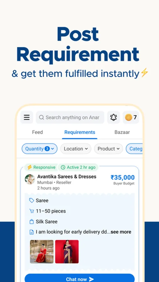 Search for your buyers and connect with them on Anar. Can't find some of your buyers? Invite them on Anar so that they can see your updates daily and also get buyers business requirements like in IndiaMart, TradeIndia, JustDial, JDMart, WhatsApp Business, Udaan & Meesho.