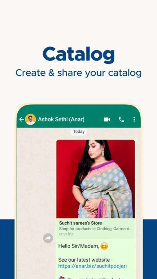 Your latest products are shared with your buyers on their feed on Anar. However, you can also send the link of your product catalog and business website to your buyers via Whatsapp Business with the One-Click share option.