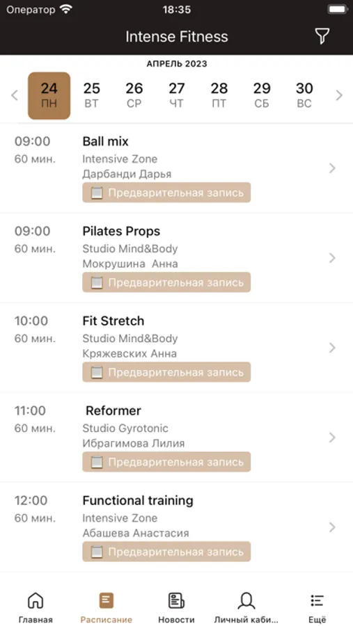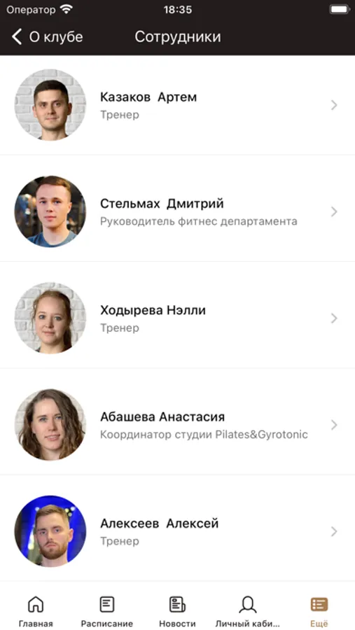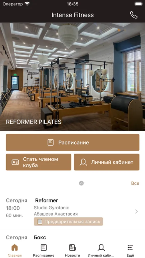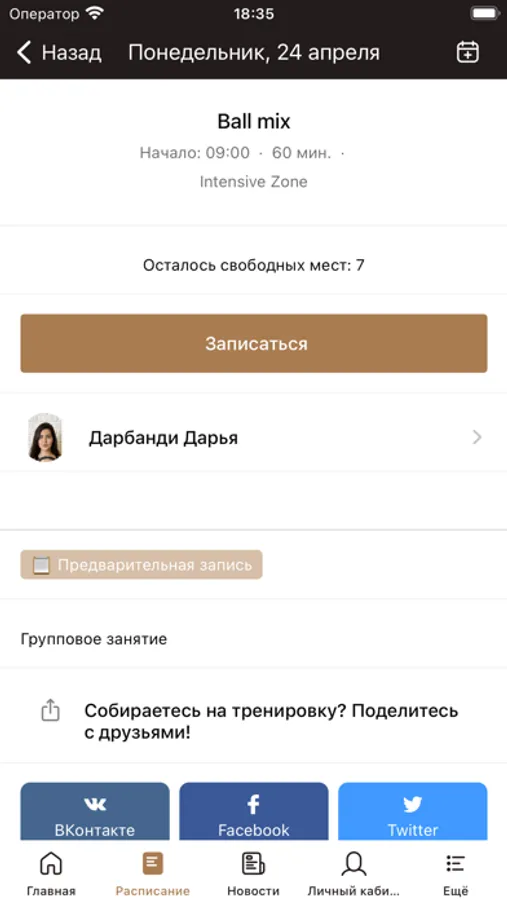 - посмотреть расписание групповых тренировок, записаться на занятие и составить список любимых тренировок;