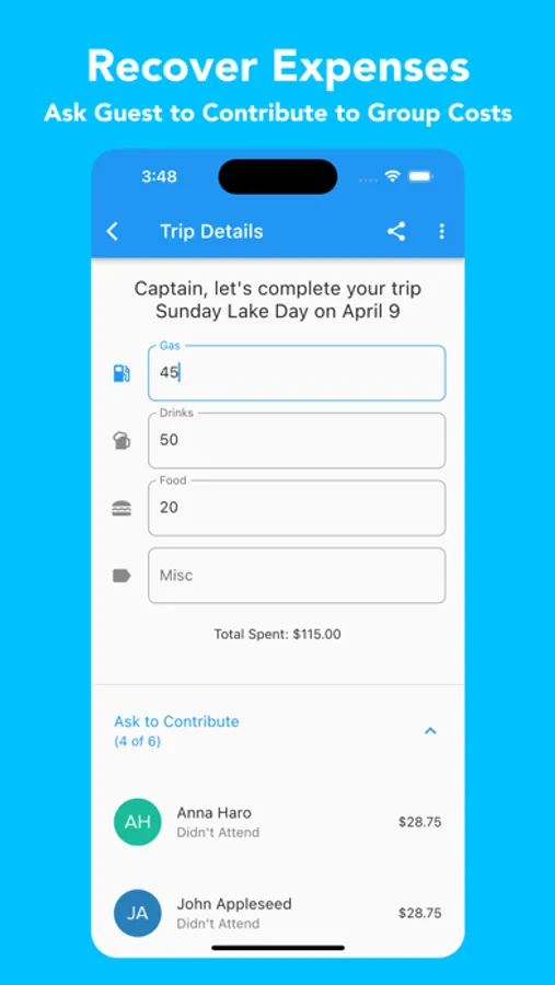 Boat with Friends also includes a powerful group cost recovery feature, which allows you to easily split the cost of fuel, food/drinks, and any other expenses associated with your boating trip. This helps avoid any awkward conversations about money while still ensuring that everyone is prompted to pay their fair share.