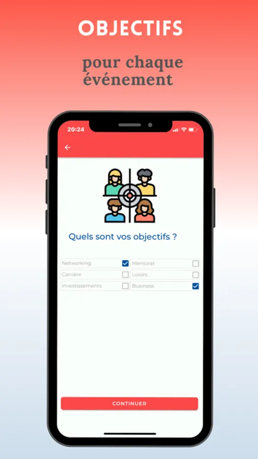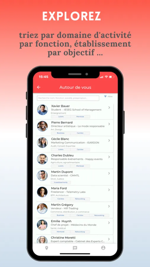 Avec LookAroun, préparez-vous à atteindre vos objectifs en toute confiance. Choisissez votre objectif avant chaque événement, que ce soit trouver de nouveaux partenaires commerciaux, établir des contacts professionnels ou chercher des mentors inspirants. Notre application vous permet de filtrer la liste des participants en fonction de leur domaine d'activité, fonction, société, et bien plus encore, afin de vous connecter avec les bonnes personnes en un instant.