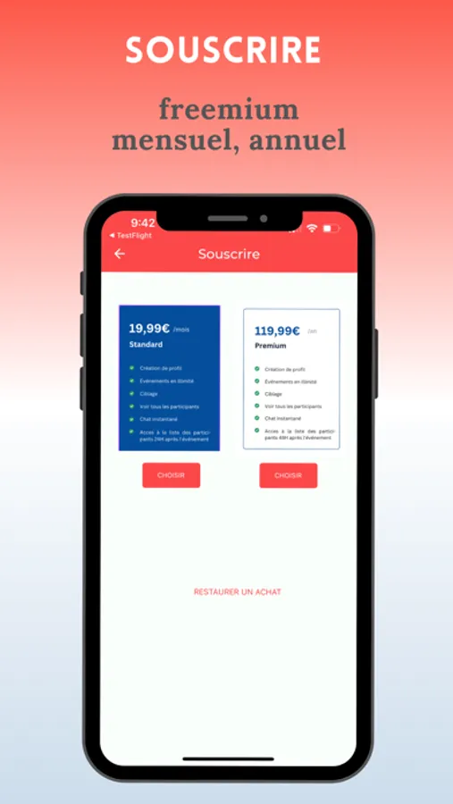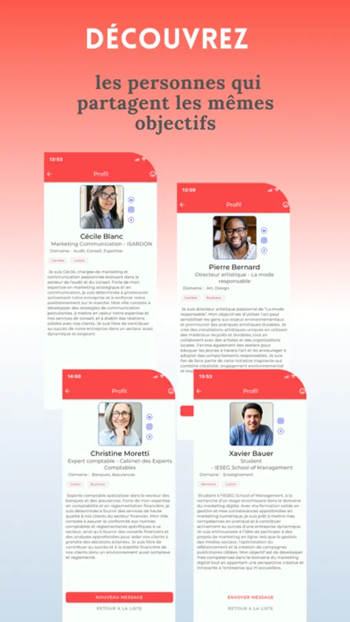 Explorez les profils complets des participants, découvrez leurs compétences et leurs intérêts communs, et accédez directement à leurs réseaux sociaux pour élargir votre connexion professionnelle. En optant pour notre abonnement freemium, vous pourrez voir la photo, le nom et le prénom des participants. Pour une expérience plus avancée, notre abonnement mensuel vous permet d'accéder à toutes les informations des participants et de communiquer avec eux avant et 24 heures après l'événement. Choisissez notre abonnement annuel et bénéficiez d'une fenêtre de 48 heures pour entrer en contact avec les participants après l'événement.