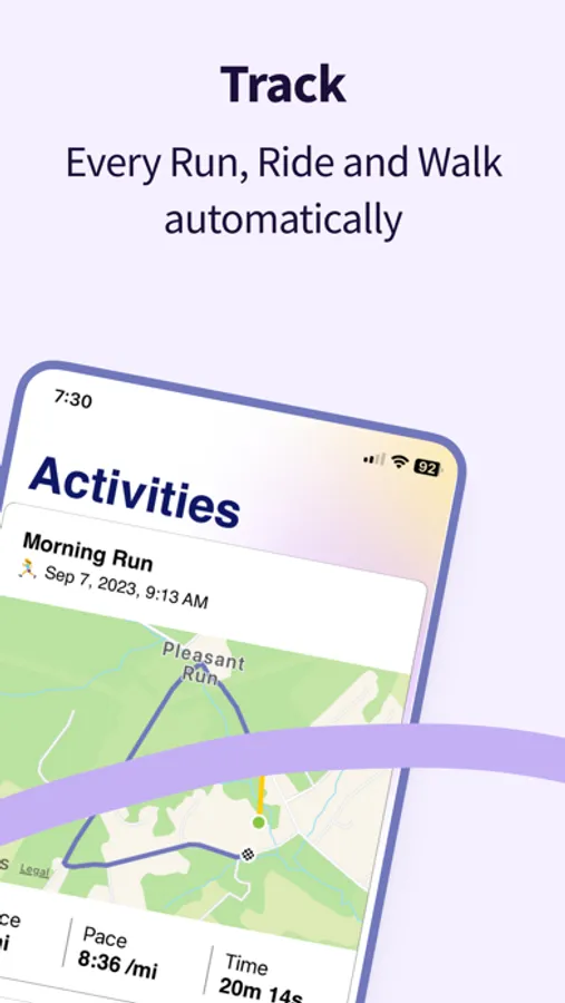 **Effortless Activity Tracking** Our state-of-the-art technology automatically recognizes your runs, walks, and rides. With no user input required, you can focus on your workout while we take care of the tracking.