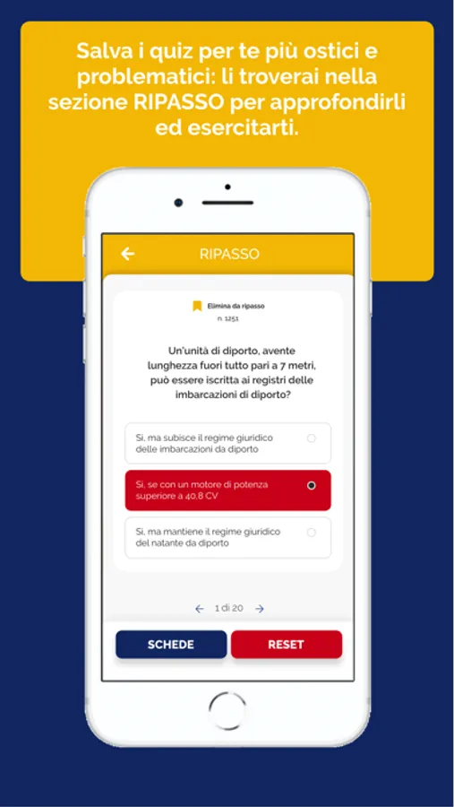 SEZIONE 4 – GIALLA: questa sezione è dedicata al ripasso. Qui ritroverai tutti i quiz salvati in fase di studio o di simulazione d’esame, sui quali puoi tornare a esercitarti per consolidare la tua preparazione.