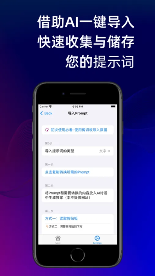 【一键导入其他提示词】:您可以将任何来源的任何类型、任何格式的提示词通过我们预设的功能方便地导入PromptBox