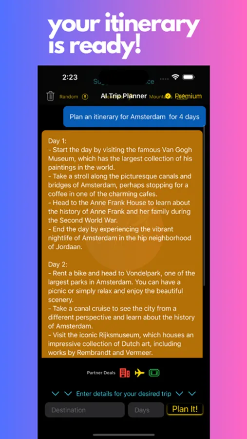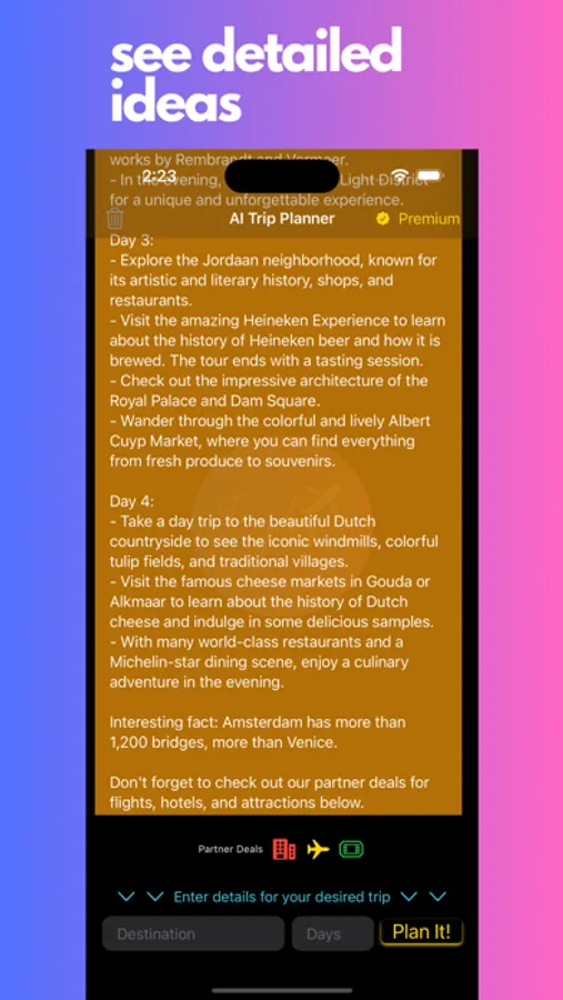 Experience the world like a true insider. AI Trip Planner not only suggests popular landmarks, but also uncovers lesser-known marvels and cultural treasures. Immerse yourself in authentic experiences by following our handpicked recommendations that go beyond the ordinary. If you want to get recommendations for hidden gems in Amsterdam, tweak your input for destination as "Amsterdam (hidden gems)"
