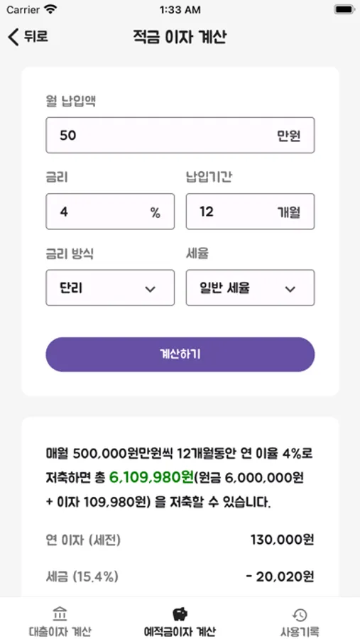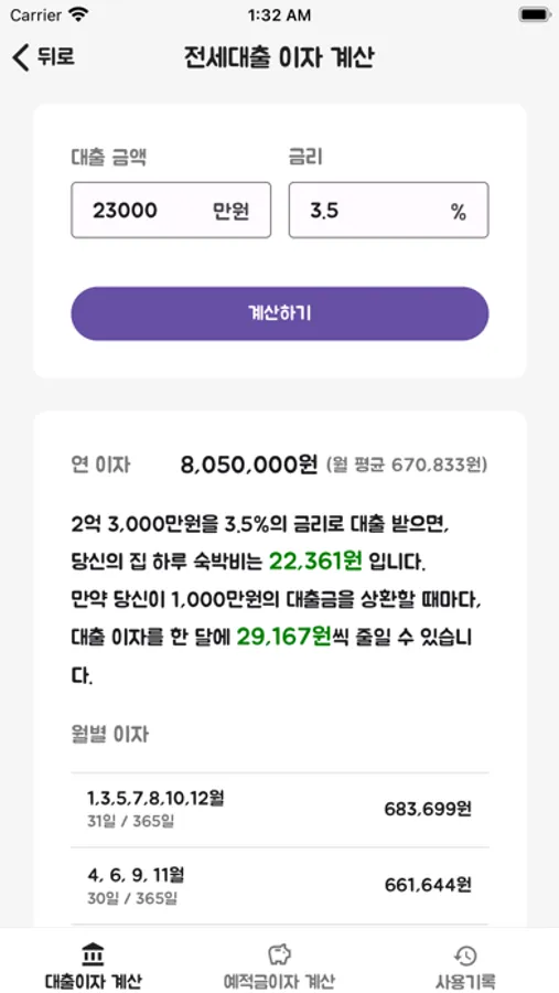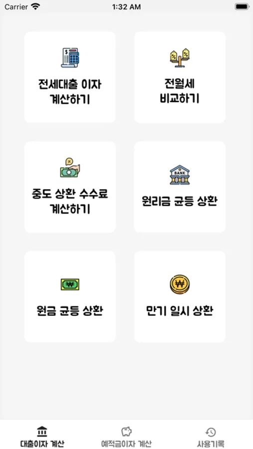 전세대출이자, 중도상환수수료, 예금, 적금 등에 대한 이자를 편리하게 계산해서 보여주는 앱입니다.