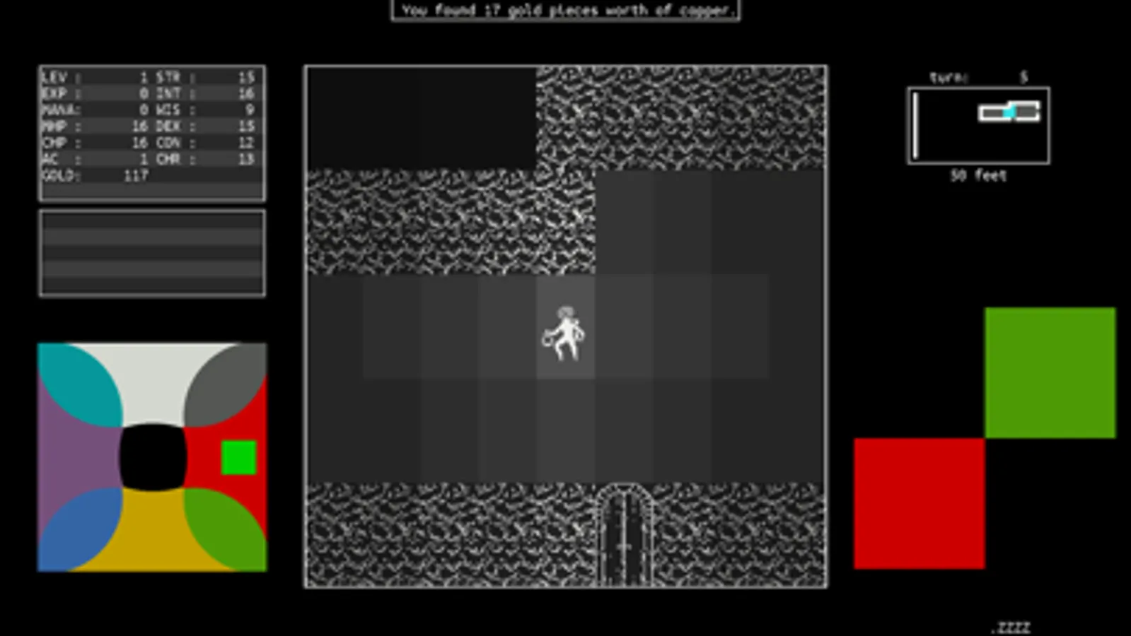 * Engages with context-sensitive interactions of the dungeon. Pick up objects, traverse the stairs, enter a store, or search for hidden traps and doors.