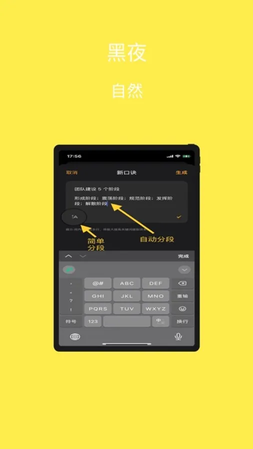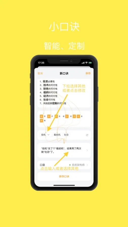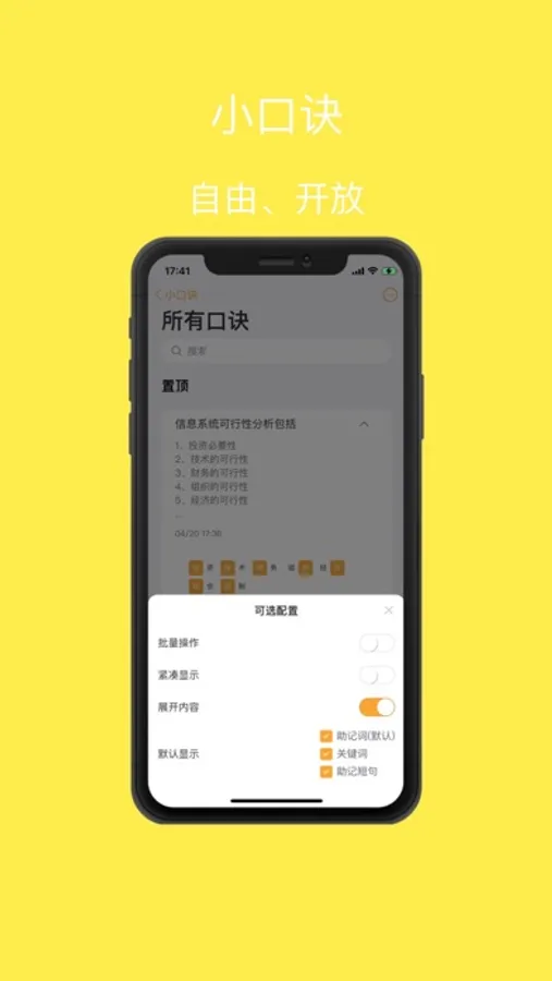 自动分析知识点关键词,然后依据谐音、象形、数字等助记方法,生成更易记忆的助记词。适合短时间、大量记忆、快速记忆、牢固记忆。