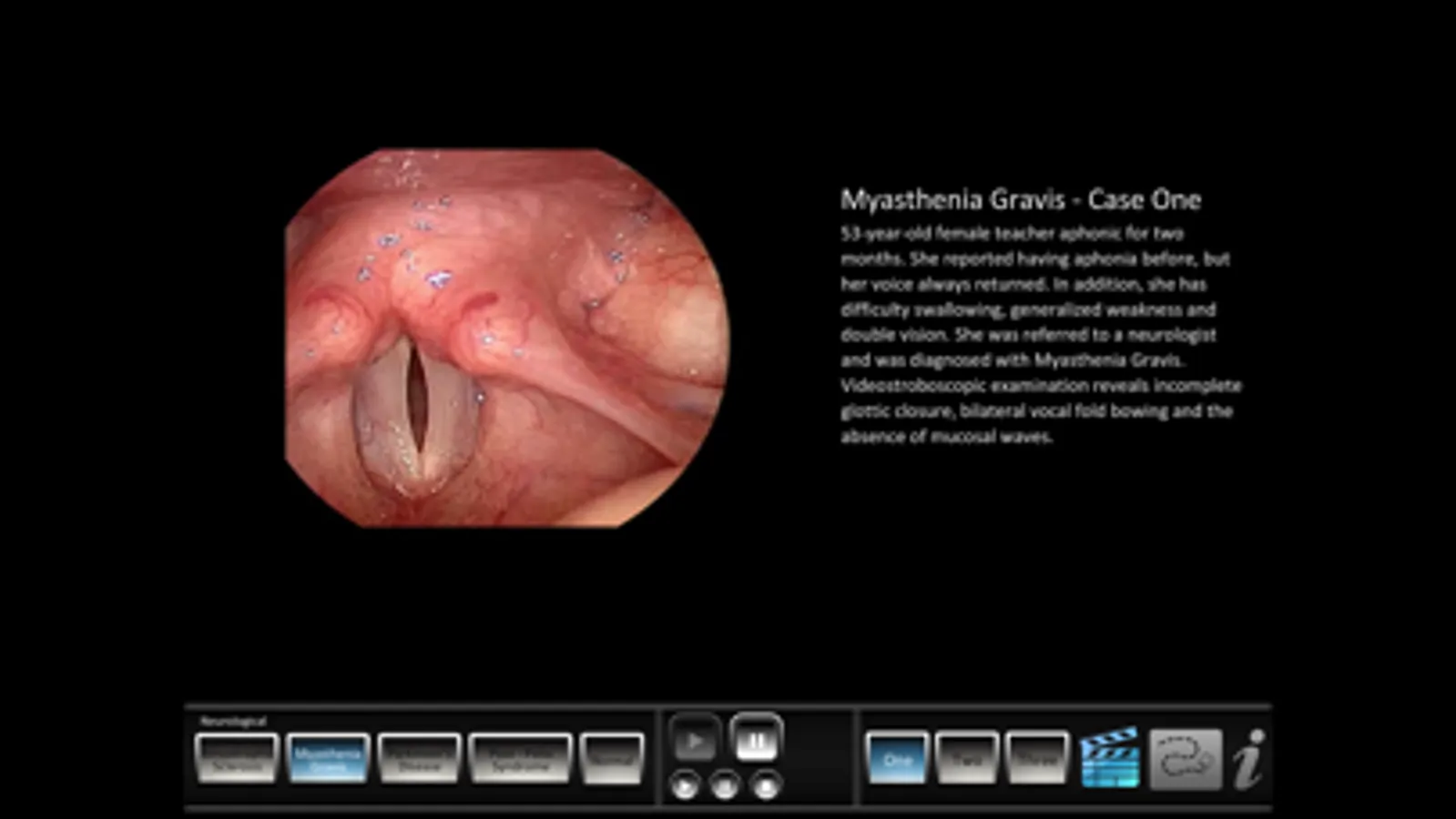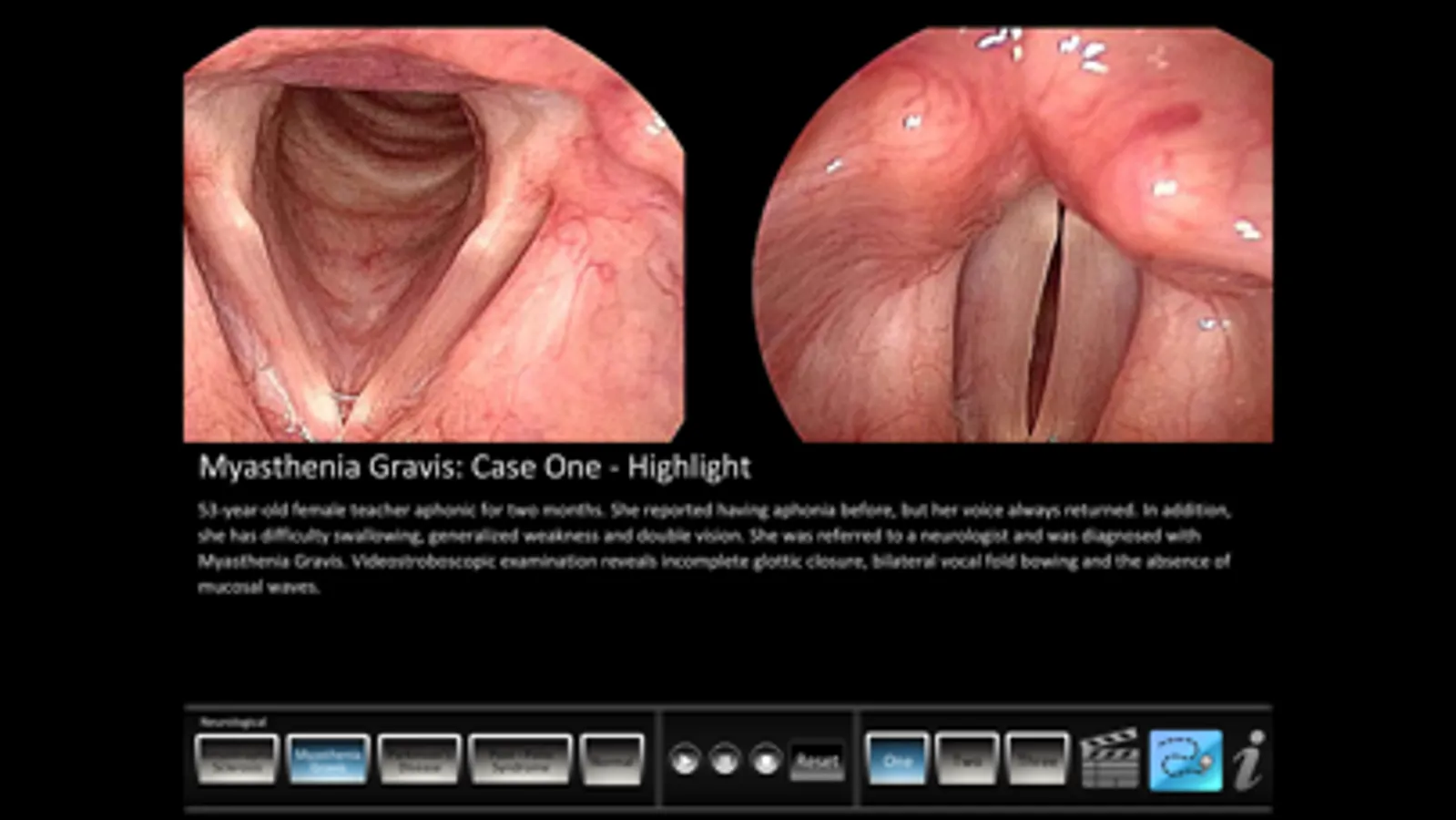 The Vocal Pathology: Neurological app helps students and patients learn and professionals teach vocal pathologies. The app features amyotrophic sclerosis, myasthenia gravis, Parkinson’s disease and post-polio syndrome videos. Each disorder case includes a key highlight view of abducted and adducted vocal folds. All disorders and normal video include an audio clip of the patient reading the rainbow passage. A normal animated vocal fold illustration, structure ID and three normal videos help patients and students both learn and contrast pathologies against normal vocal folds. Disclaimer: seek a doctor’s advice in addition to using this app and before making any medical decisions.