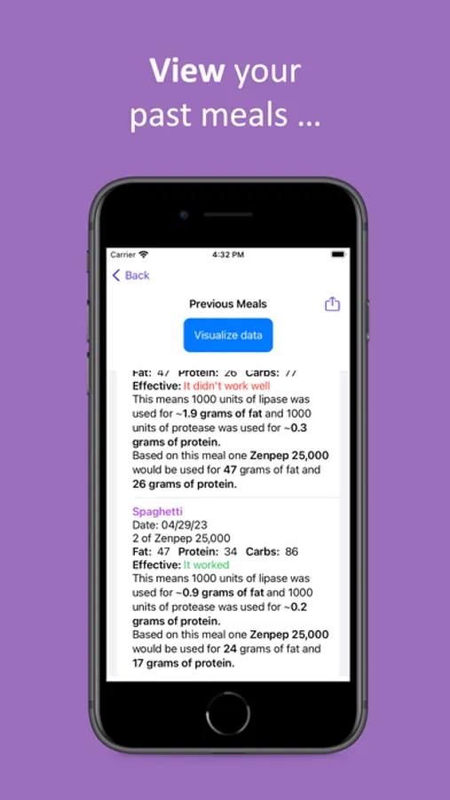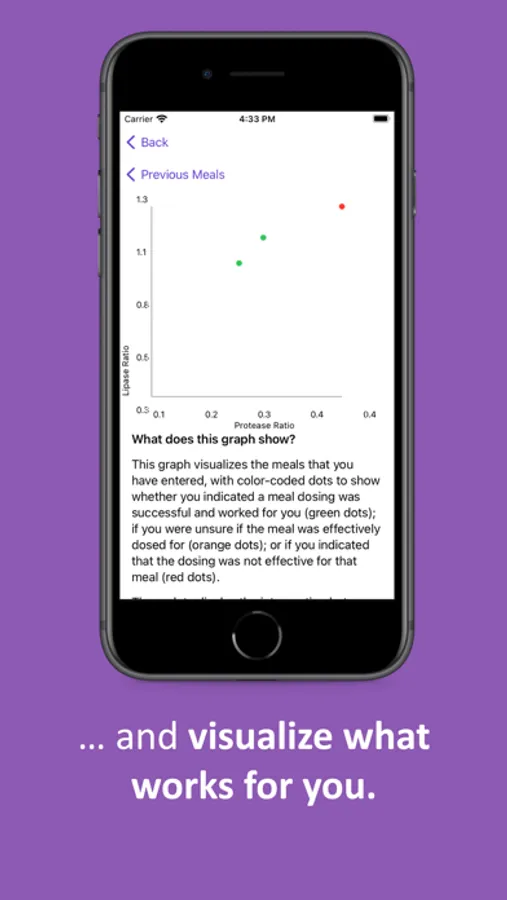 PERT Pilot enables you to review all of the data you entered, including displaying a graph to help visualize the meals that you say worked for you, and those where you were unsure if the dosing worked and those you decided didn't work for you.