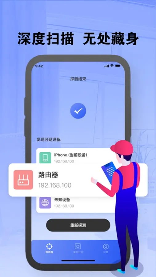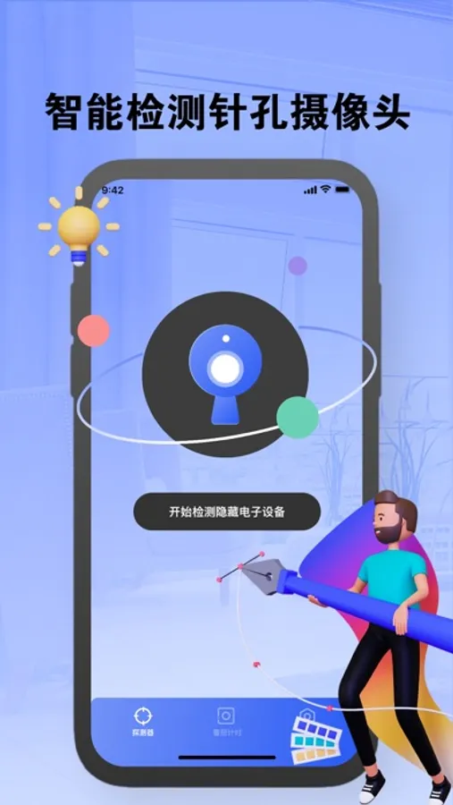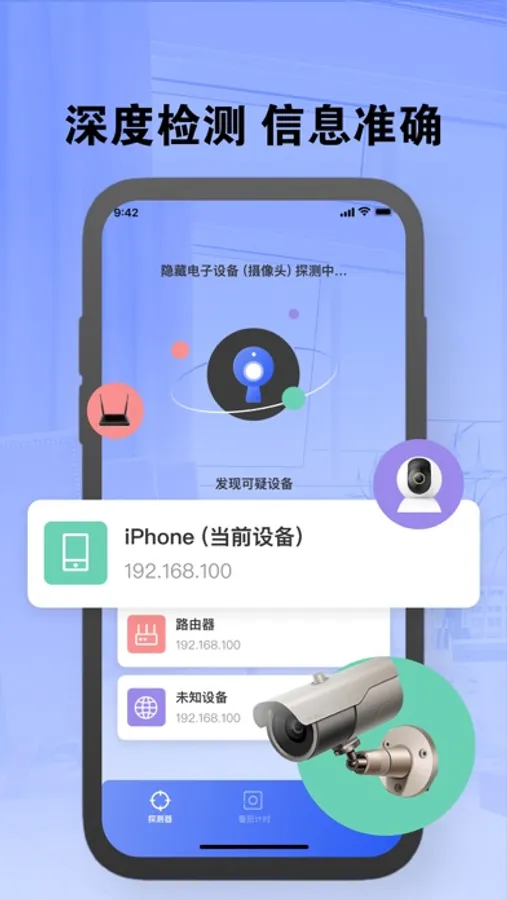 其晟摄像头探测器可帮助您检测周围环境里是否存在摄像头,利用多种技术深度探查,无论民宿、酒店、租房,无论针孔摄像头、红外线摄像头,让隐藏式摄像头们无处遁形,严防偷拍,保护您的个人隐私。