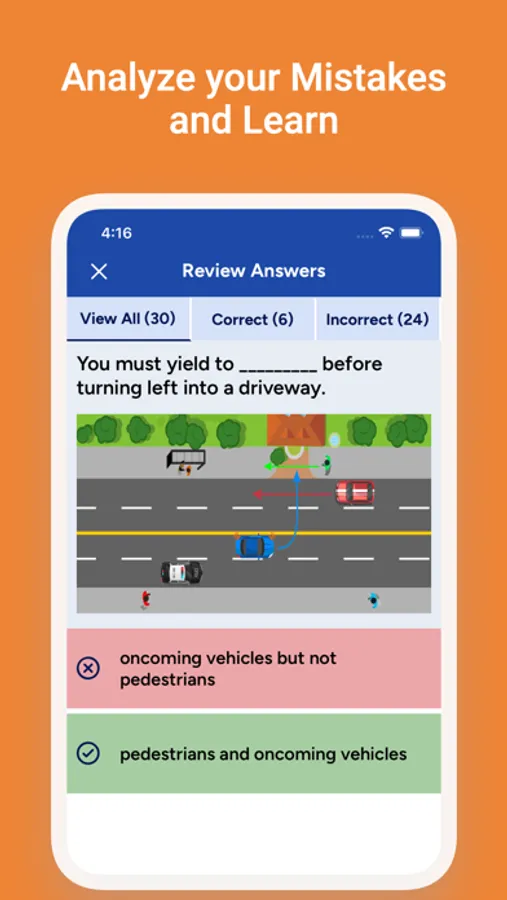 You will get the test result based on the official criteria to pass the Driver’s License Test. You will also be able to find out what questions you've done wrong after taking the test.