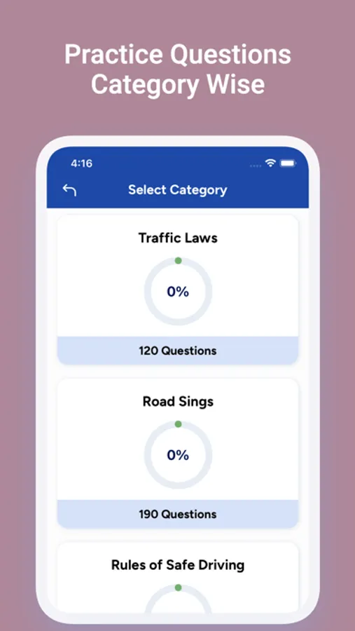 The app includes a practice module that allows to get familiar with questions that fall under different categories like Traffic Rules, Road Signs and Rules of Safe driving. It also keeps track of the progress you have made in each category. It contains questions from following categories: