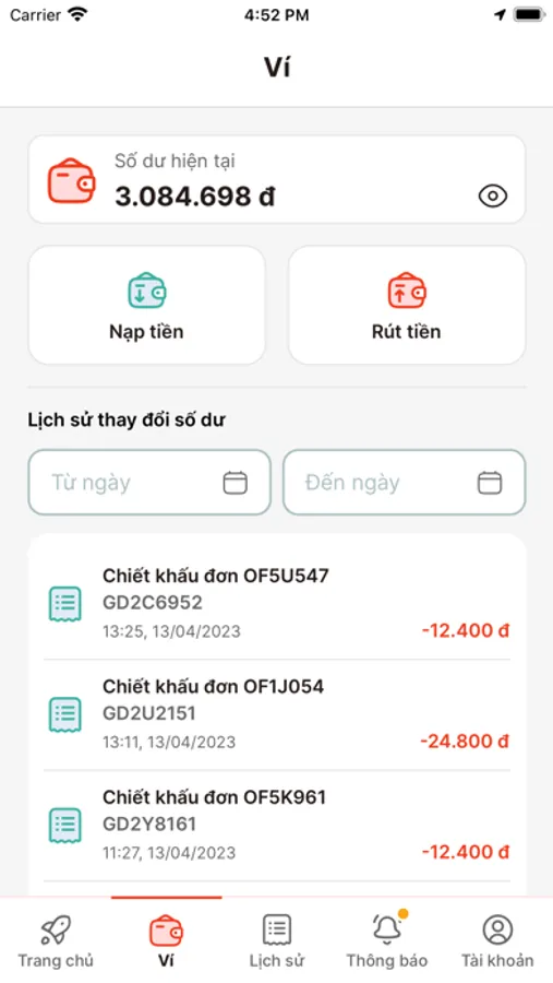- Tài xế có thể Kiển tra lịch sử tặng điểm và tổng số tiền trong ví hiện có