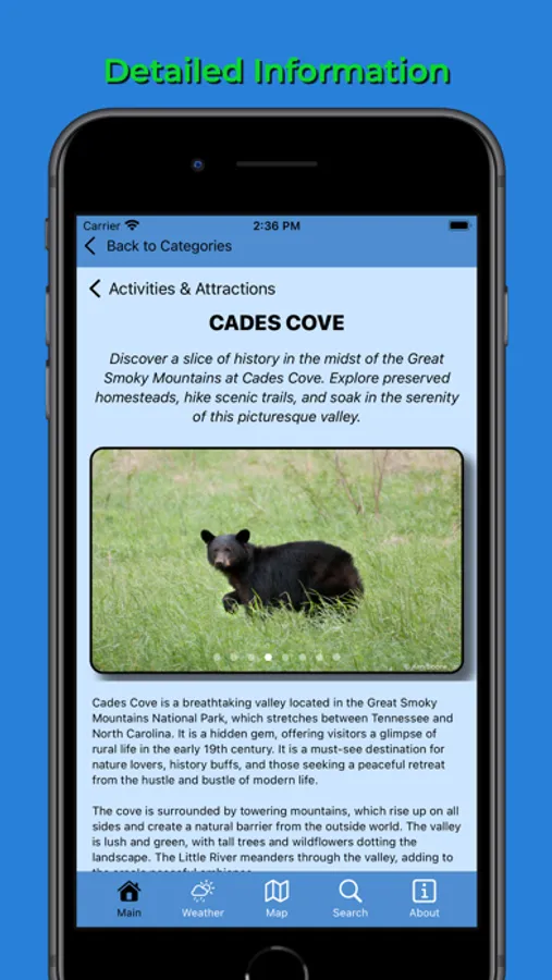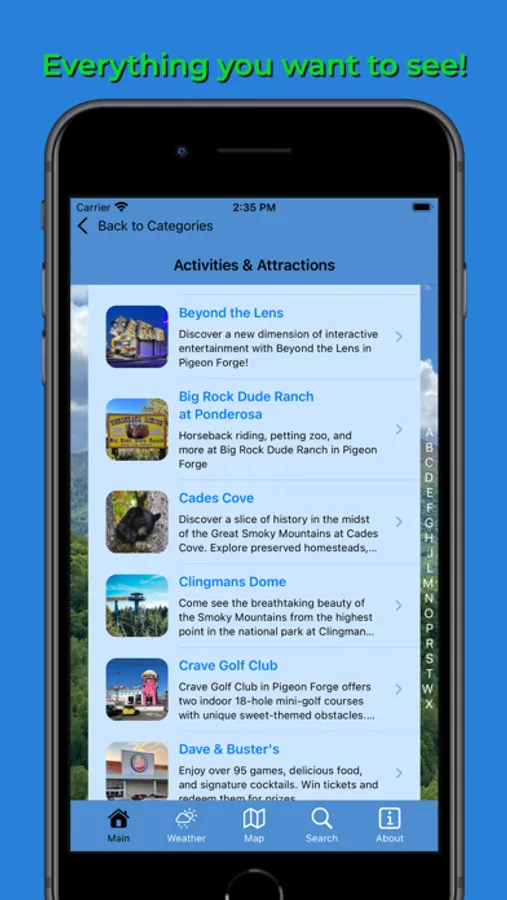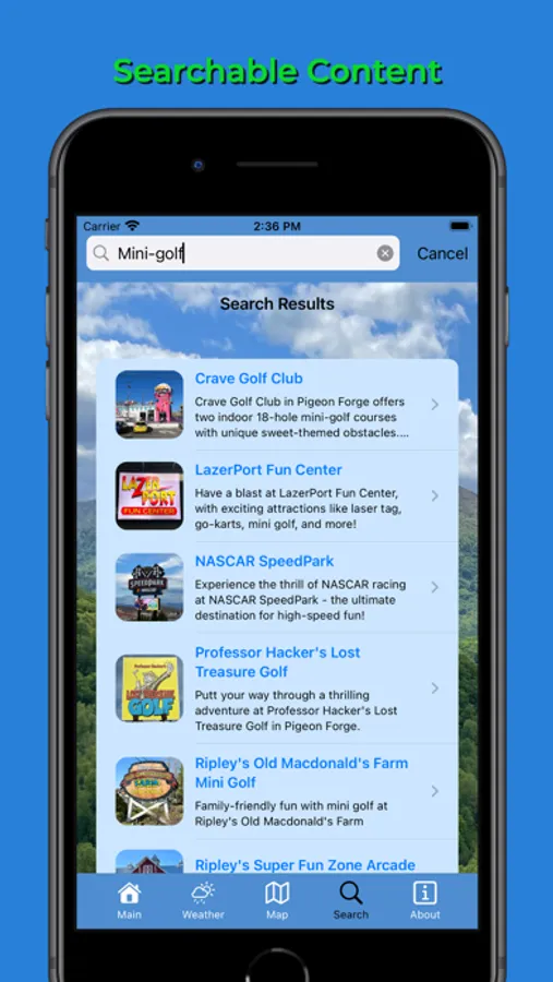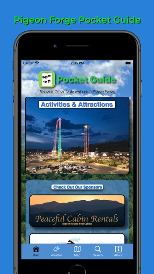 The Pigeon Forge Pocket Guide app is packed with information on all of the main attractions, as well as the smaller, lesser-known venues and attractions. It also includes a search feature that allows you to easily find locations by searching their name, tagline, or description.