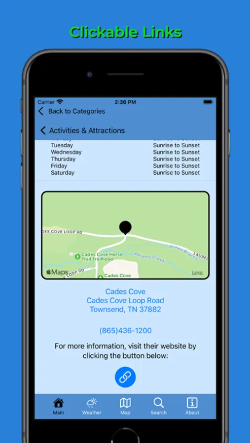 When a user selects a location from the list, they'll be taken to a detailed view with a wealth of information about that location. Along with a description and pictures, the app also displays a mini-map that shows the location of the venue. The address listed for each venue is clickable, allowing users to initiate Apple Maps navigation to that location with ease. Additionally, users can simply tap on the phone number to instantly call the venue, or click on the website link to visit the location's website in their device's default browser. With these features, users can easily access all the information they need to make their Pigeon Forge experience the best it can be.