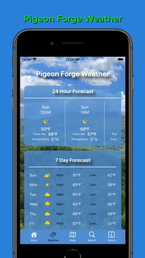 Lastly, the app provides weather information for Pigeon Forge, including current weather, 24-hour hourly forecasts, and 7-day forecasts, powered by Apple Weather.