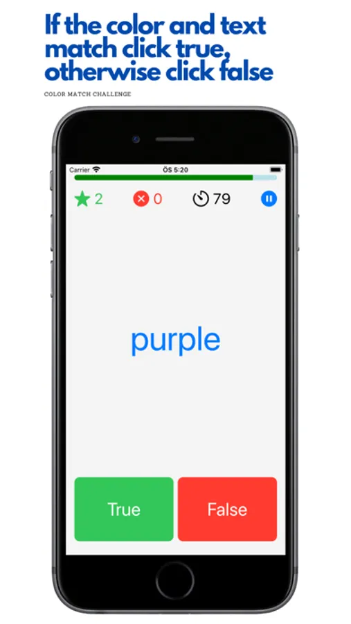 Simply read the name of the color displayed on the screen and decide whether it matches the color of the text. Tap "True" if it matches, and "False" if it doesn't. Be quick, as the clock is ticking in Time Attack and Survival modes!